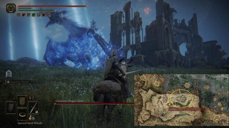 If you advance, a miniboss, Glintstone Dragon Adula, will appear. It’s the same beast that you fought earlier in Three Sisters/Ranni’s Rise (the one that flew away at 50% health). You can beat it now if you wish.